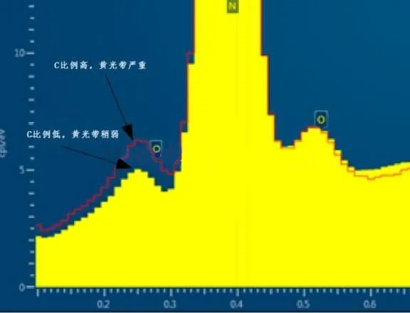 (重点):如果黄光带强度较高,芯片发光颜色会直接显示黄色;如果黄光带强度较低,远低于光谱中的蓝光和紫光部分,那么黄光会与蓝光紫光混合发出白色的光线。